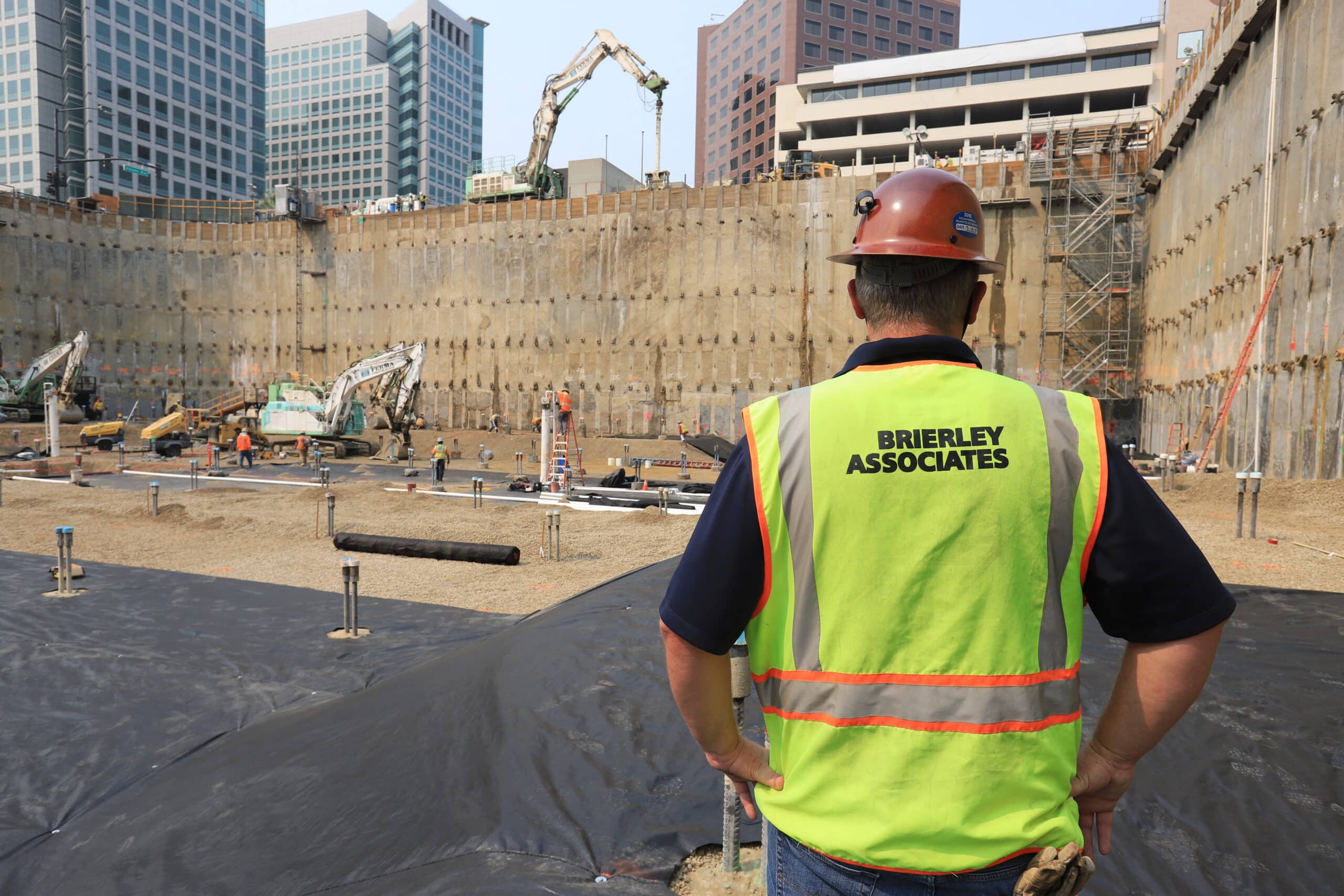 Brierley Associates joined the team of LANGAN and Malcolm Drilling to construct a 4 level below grade parking garage beneath a planned 19-story office tower. The 54–58 ft deep excavation, four levels below grade, occupies the entire footprint of the site. Installation of the shoring system installation began in December 2019 and mass excavation was completed in September 2020. Construction of the office tower was completed during the summer of 2022. During the excavation of the basement, the adjacent property and streets needed to be supported by temporary shoring. Several key issues were considered while selecting a suitable shoring system for the project. As the shoring designer, Brierley Associates selected a tied-back cutter soil mixing (CSM) cutoff wall that was approximately 39-inch thick and reinforced with W27 beams spaced 41-inches on center.