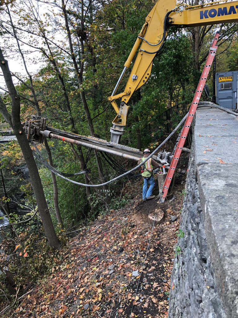 Given challenges posed by site access, ground conditions, and buried utilities, our team recommended a soil nail solution to stabilize the retaining wall. Initial stabilization of the existing masonry facing and filling of the void caused by erosion was accomplished through the application of unreinforced shotcrete. 14-ft long soil nails were installed at 3-ft by 4-ft horizontal and vertical spacing, at the critical point near the center of the wall at the collapsed area. Soil nail spacing was increased at the periphery of the wall, where the wall heights are less. A primary facing of reinforced shotcrete and weep holes were placed upon completion of soil nail installation.
